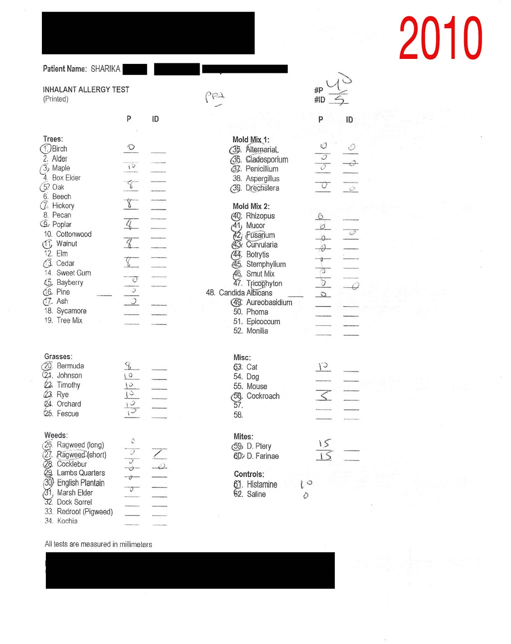 Surprisingly, my allergies have worsened! Now, I’m allergic to weeds and my grass and tree allergies pretty much doubled or more. Ugh! Take a look at my results from 2010 (top) vs this year (bottom).